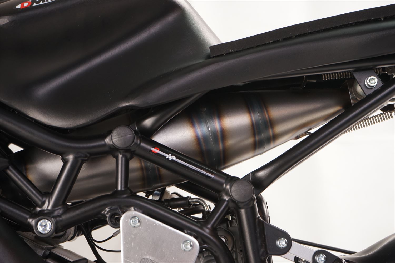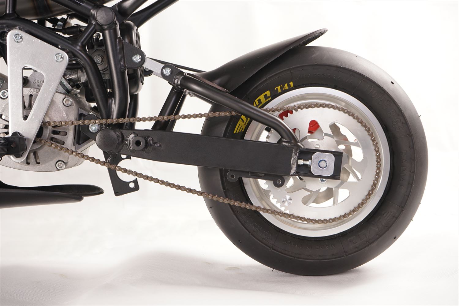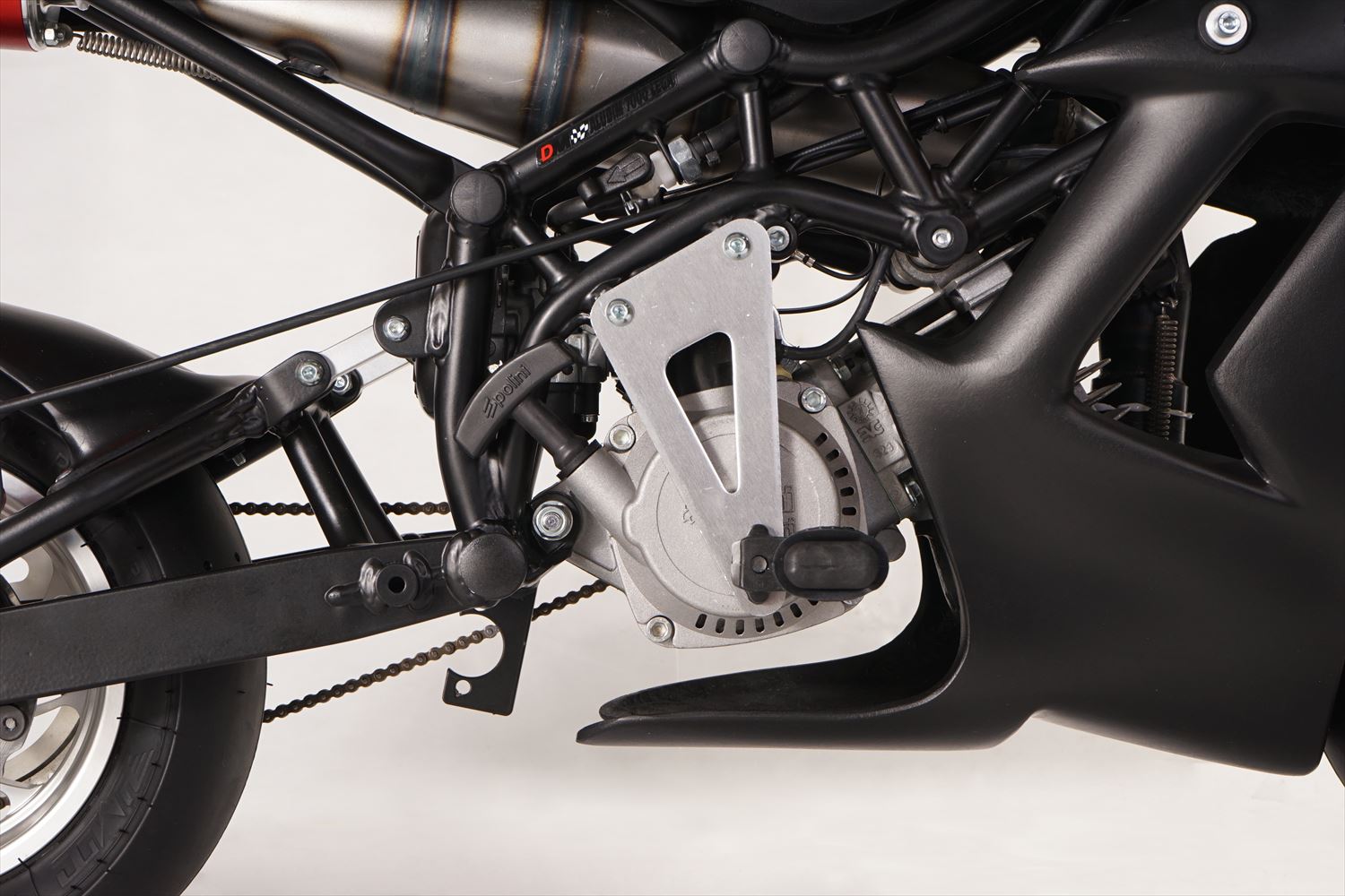 新しいカウルは革新的なデザインのグラスファイバー製マットブラック。抜群の耐久性と空力を実現し、スチール製スイングアームとの統一デザイン。