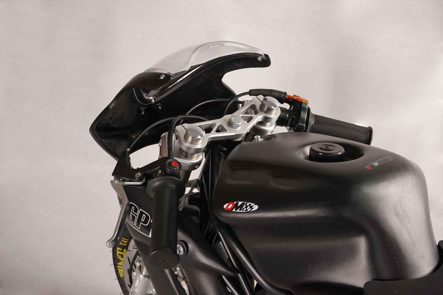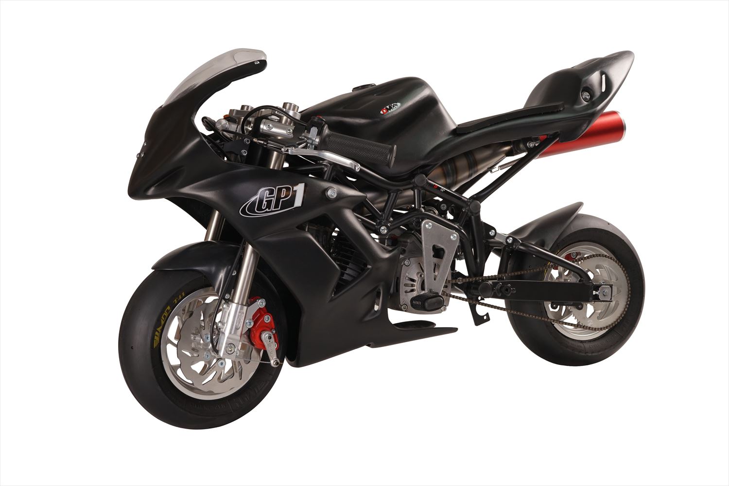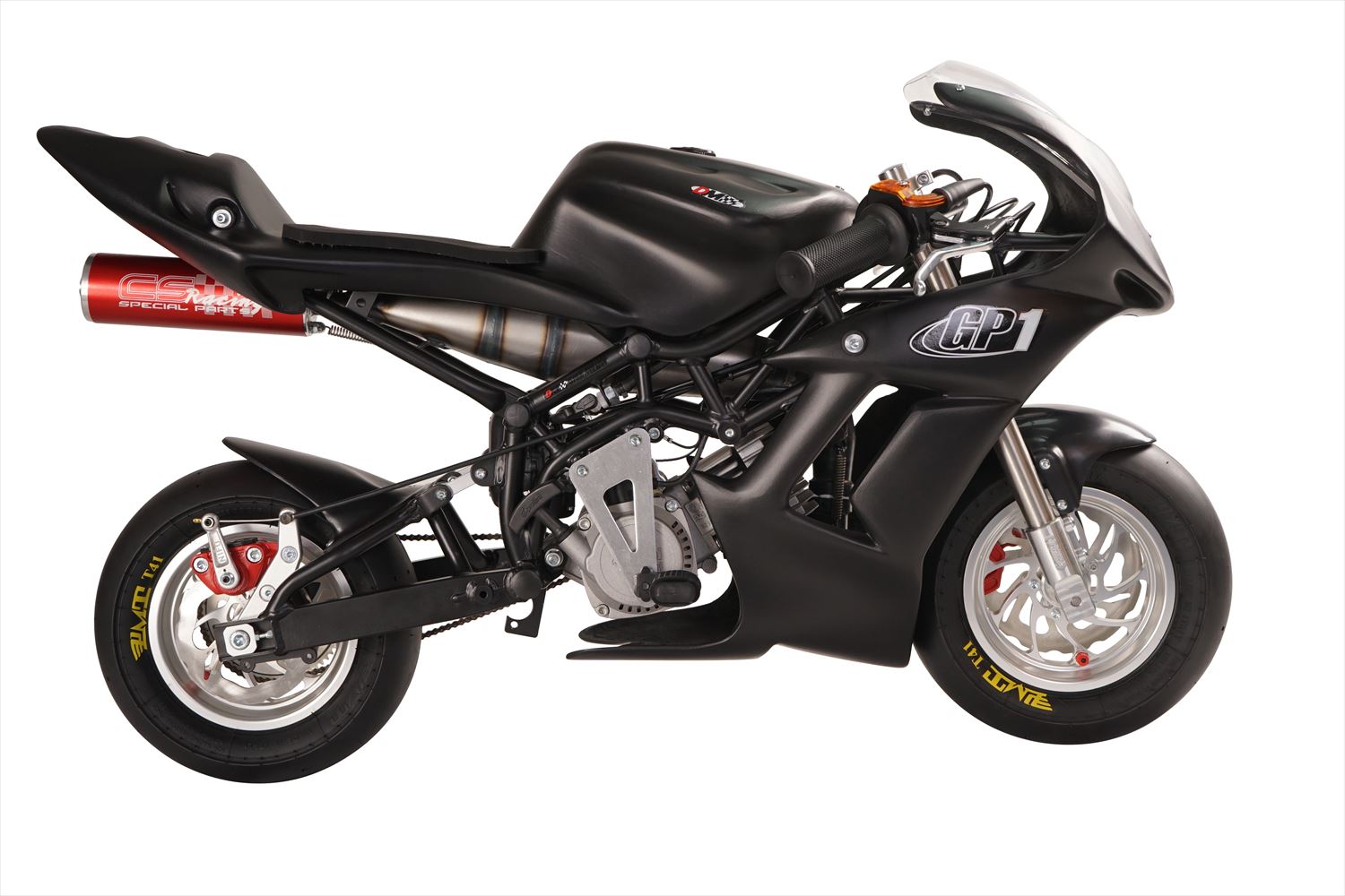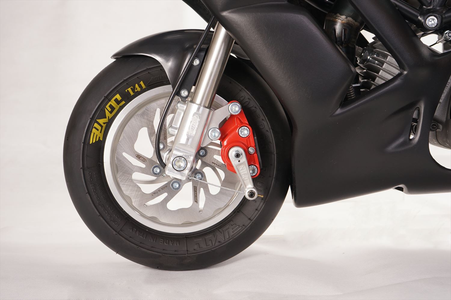 新しいカウルは革新的なデザインのグラスファイバー製マットブラック。抜群の耐久性と空力を実現し、スチール製スイングアームとの統一デザイン。